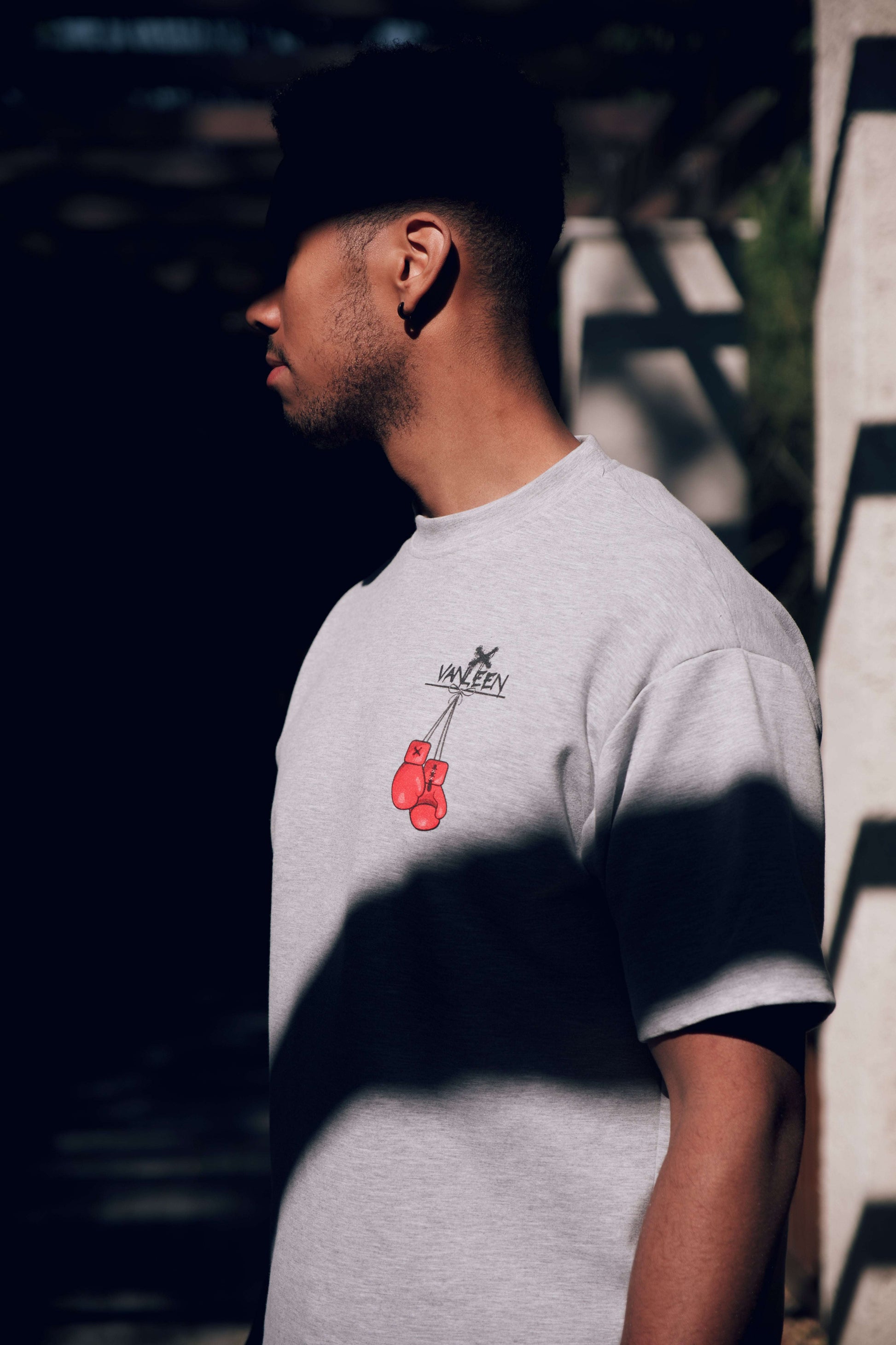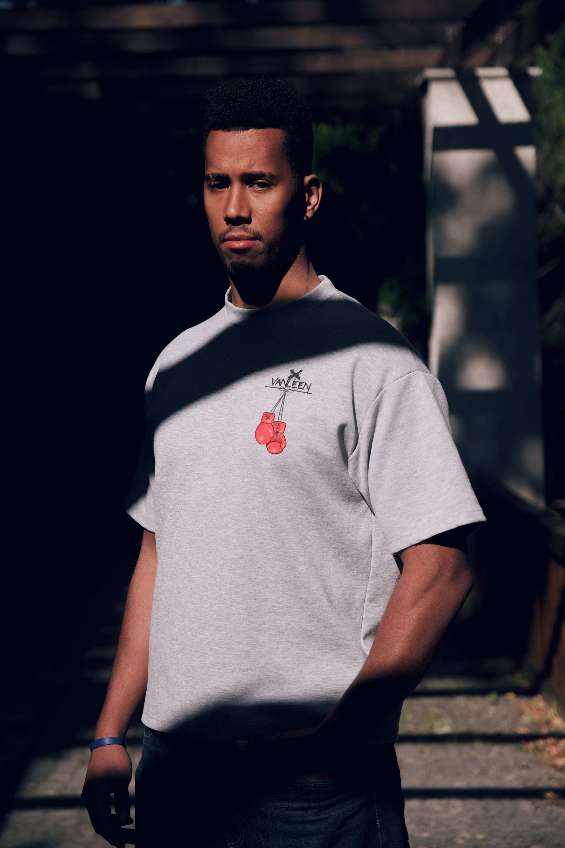 Der kühle Grauton trifft auf den markanten Print mit roten Boxhandschuhen ein Statement zwischen Stärke und Zurückhaltung. Der relaxed Oversized Fit verleiht dem Shirt eine moderne Silhouette, während das gestickte „X“ Detail am Nacken den unverkennbaren VANLEEN-Touch setzt.